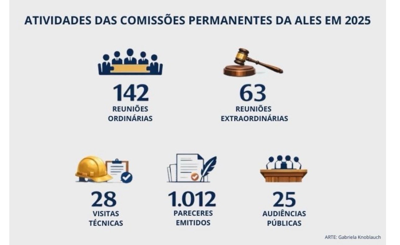A Assembleia Legislativa do Espírito Santo (Ales) encerrou 2025 com uma atuação intensa e diversificada de seus colegiados, que somaram centenas de reuniões, audiências públicas, visitas técnicas e ações institucionais ao longo do ano. O trabalho envolveu as 18 comissões permanentes, quatro comissões especiais em funcionamento, duas Comissões Parlamentares de Inquérito (CPIs) e 40 frentes parlamentares ativas, das quais nove foram instaladas no ano passado.